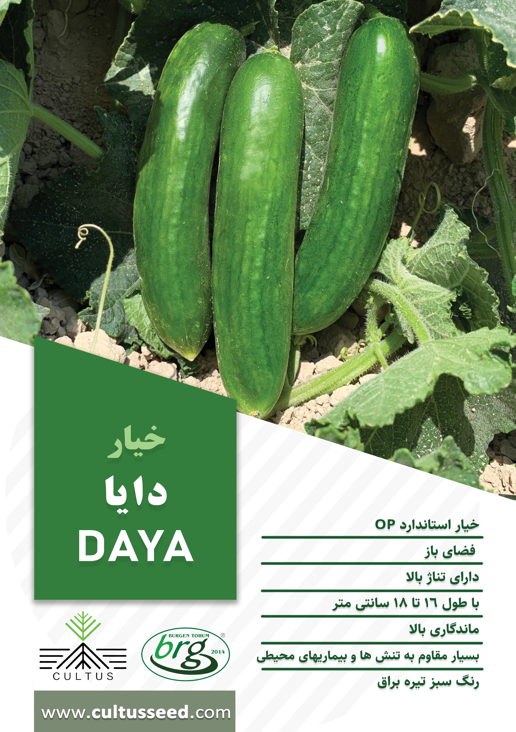 بذر خیار دایا از ارقام بذری استاندارد و مناسب برای کشت در فضای باز می باشد. دایا بسیار سازگار با طبیعت بوده و در برابر تنش های محیطی و سرما مقاوم است. گیاه حاصل از این بذر دارای راندمان منظم و بسیار عالی در طول دوره رشد است و ساختار آن به گونه ای است که بیشترین باروری را در فصول بهار و تابستان می دهد. طول میوه حاصل از این بذر بین 16 الی 18سانتی متر و به رنگ سبز تیره است که دارای طعم بسیار دلپذیر است. این رقم مانند سایر ارقام خیار استاندارد در کنار گل های ماده دارای گل های نر نیز می باشد. هر پاکت یکصد گرمی از این بذر تقریبا حاوی 3000 تا 3500 عدد بذر می باشد.